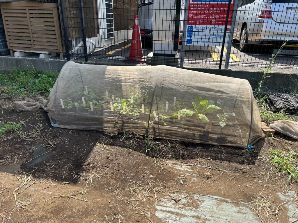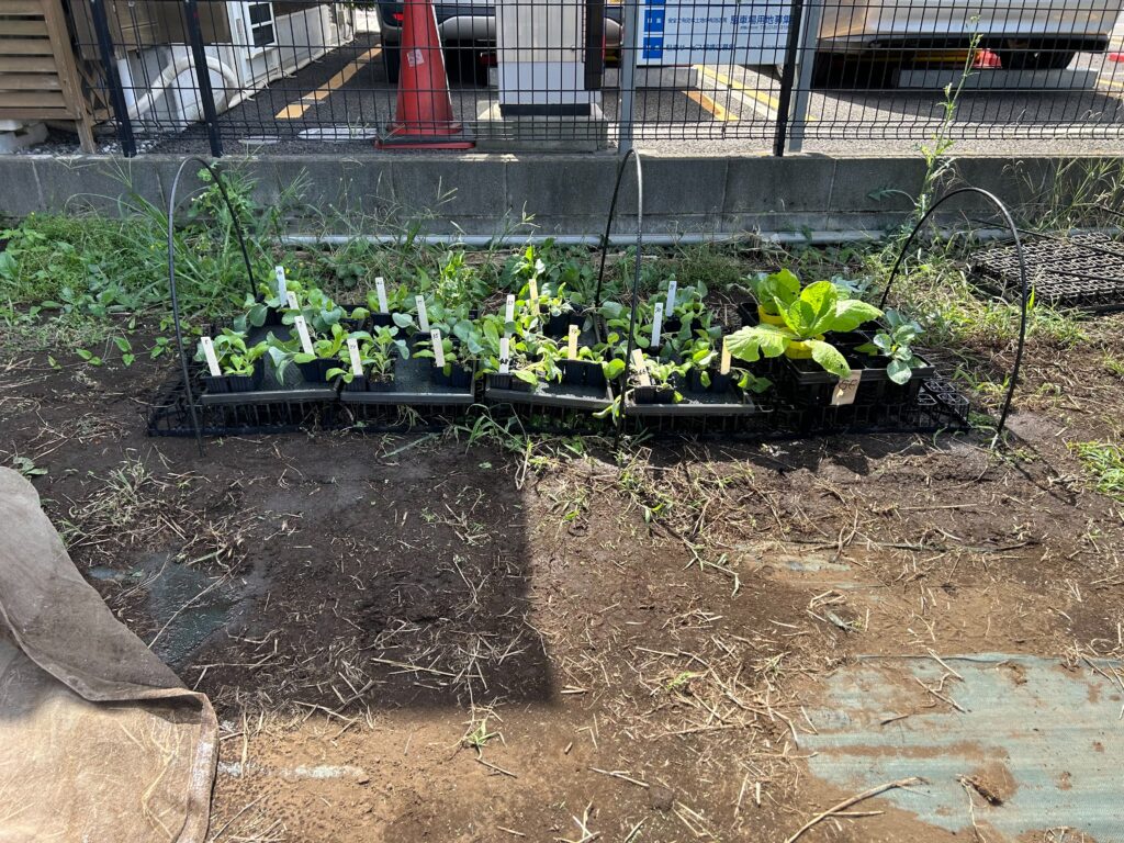ブロッコリー3苗、白菜3苗、区画番号札を確認のうえ、植え付けて下さい。