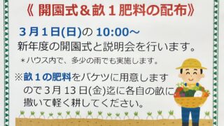 お知らせ 開園式&畝1肥料の配布 3月1日(日)の10:00〜新年度の開園式と説明会を行います。*ハウス内で、多少の雨でも実施します。※畝1の肥料をバケツに用意しますので3月13日(金)迄に各自の畝に撒いて軽く耕してください。 2026.02.17 お知らせ